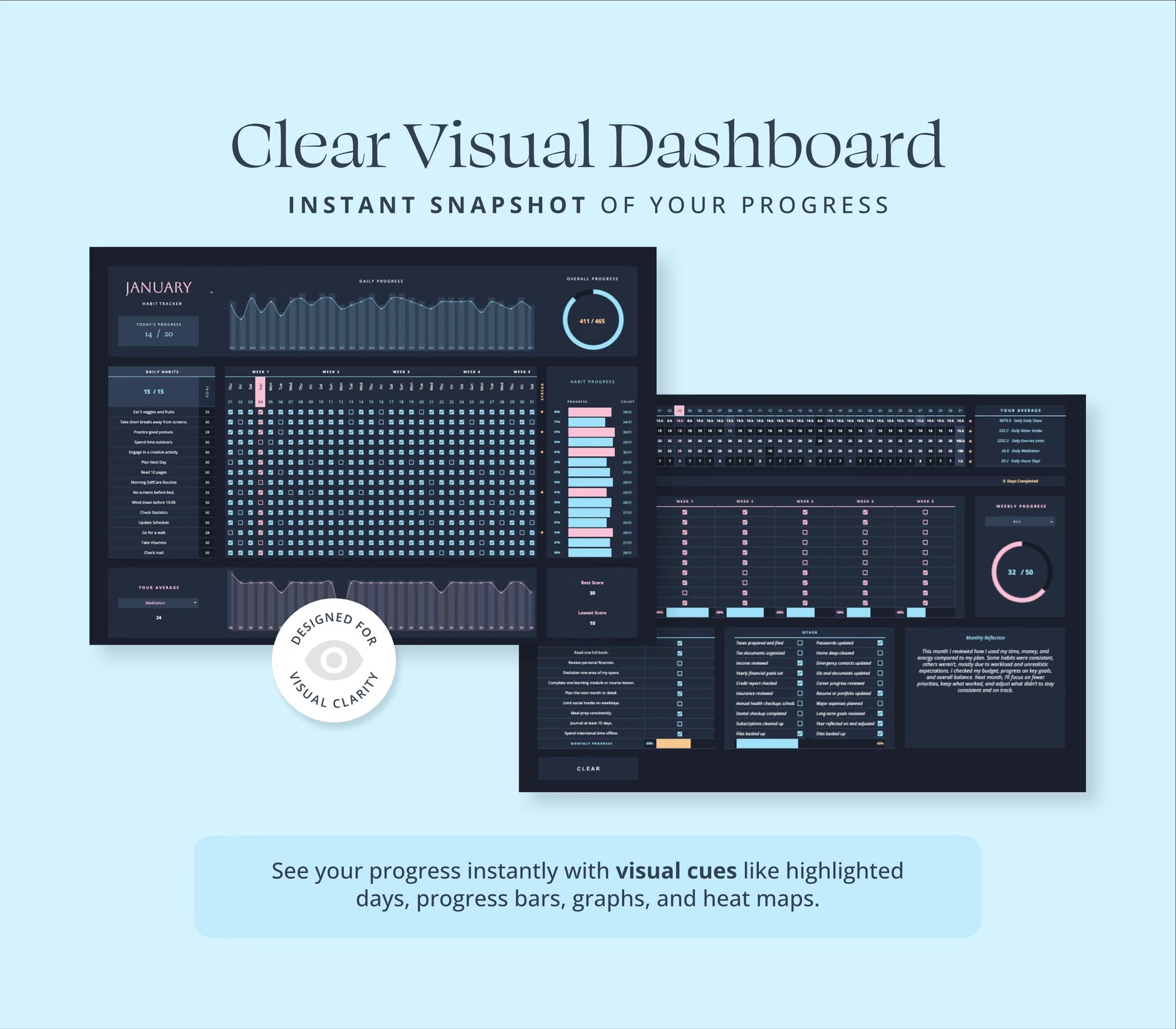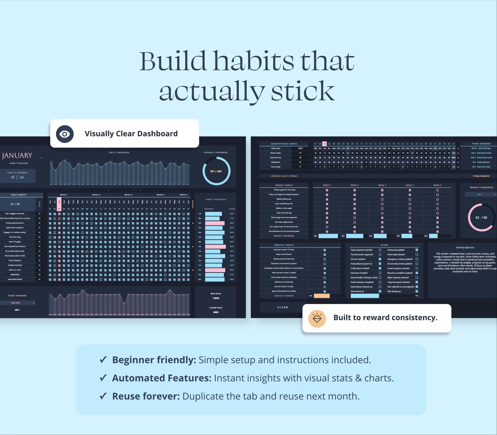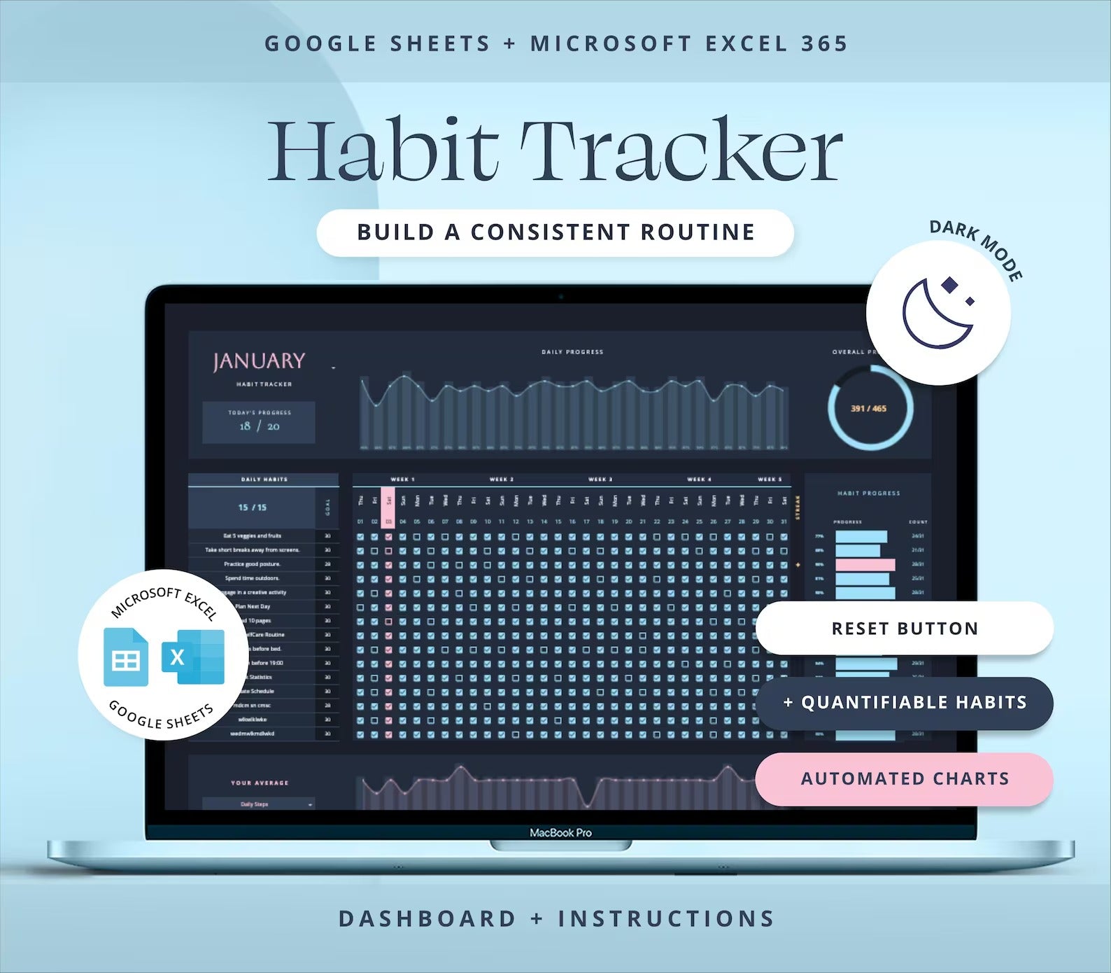 Build better habits, boost consistency, and stay organized with the Dark Mode Habit Tracker Spreadsheet — your personal accountability system designed for Google Sheets and Excel 365.