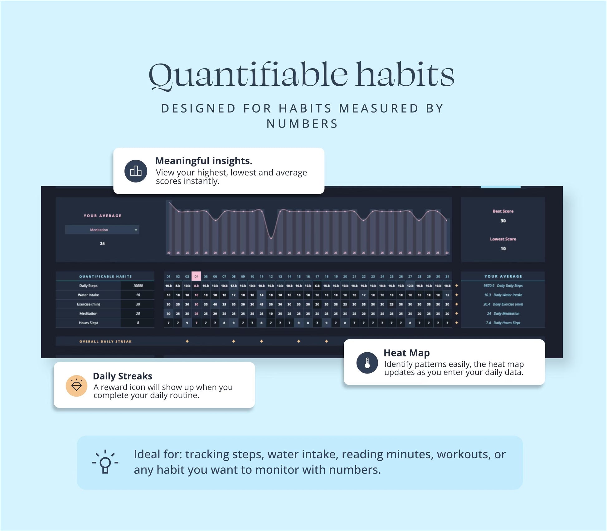Create your own habit list and monitor progress across different timeframes:
