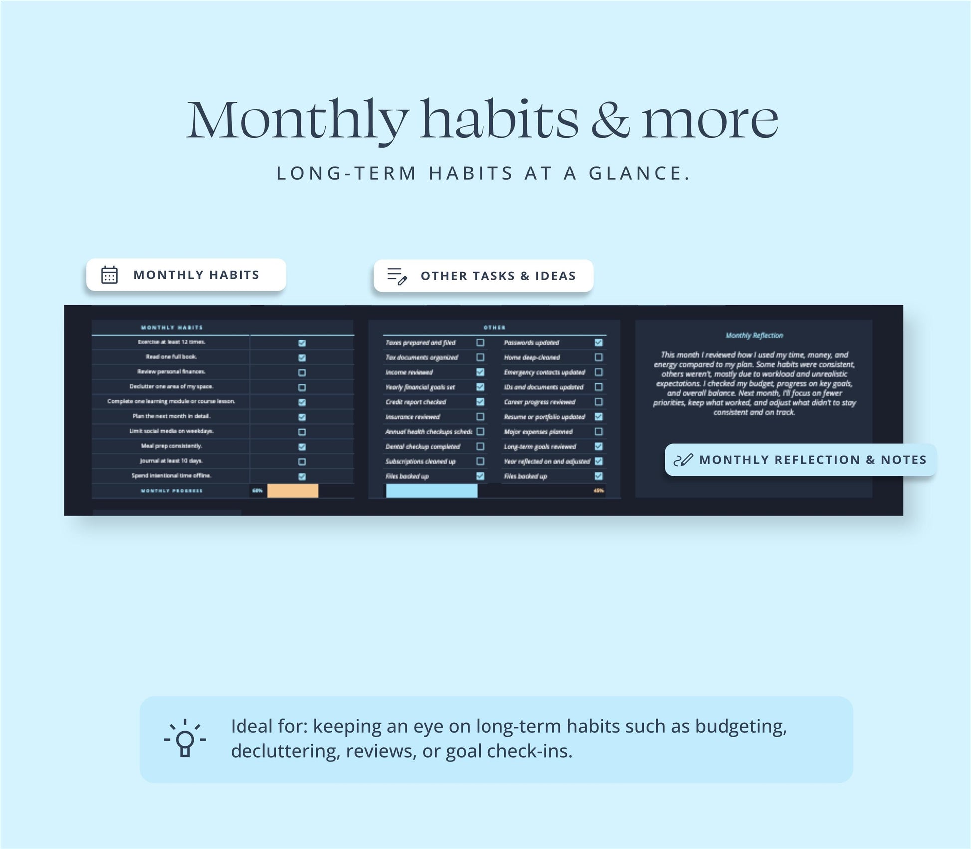 “I’ve tried many digital planners, but this spreadsheet is the first one that actually fits my workflow. I can track goals, tasks, and habits in one place.” –—